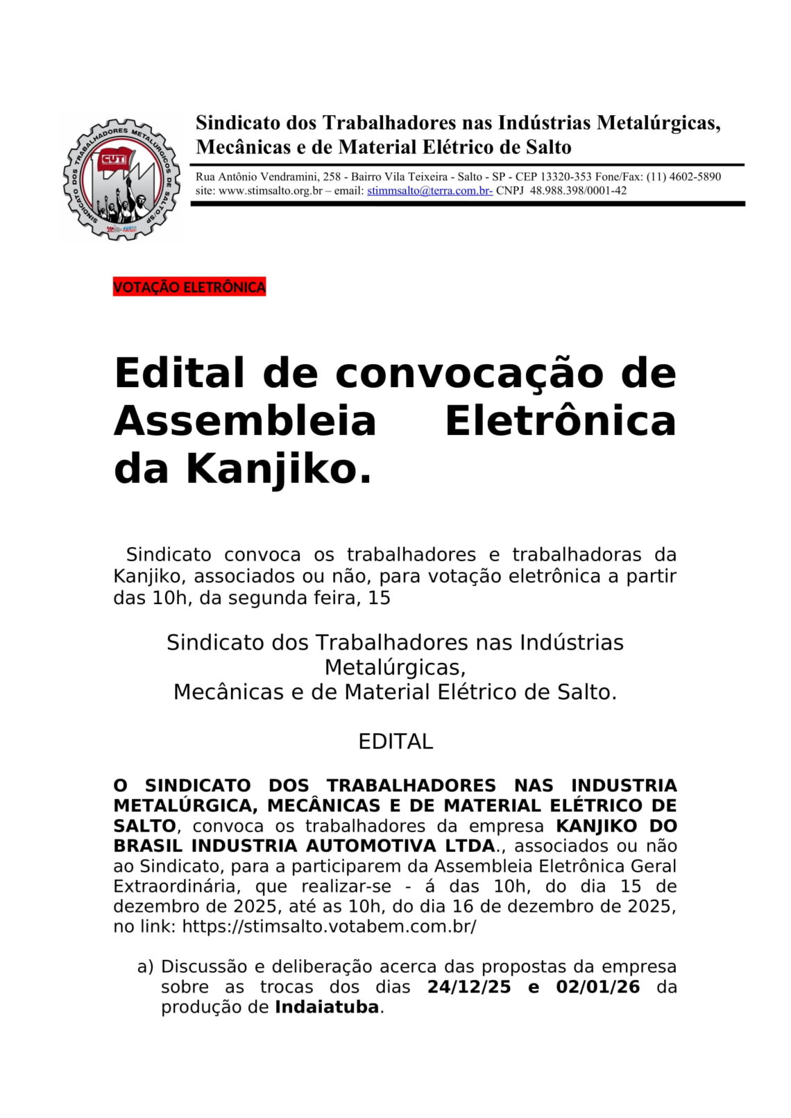 O SINDICATO DOS TRABALHADORES NAS INDUSTRIA METALÚRGICA, MECÂNICAS E DE MATERIAL ELÉTRICO DE SALTO, convoca os trabalhadores da empresa KANJIKO DO BRASIL INDUSTRIA AUTOMOTIVA LTDA., associados ou não ao Sindicato, para a participarem da Assembleia Eletrônica Geral Extraordinária, que realizar-se – á das 10h, do dia 15 de dezembro de 2025, até as 10h, do dia 16 de dezembro de 2025, no link: https://stimsalto.votabem.com.br/